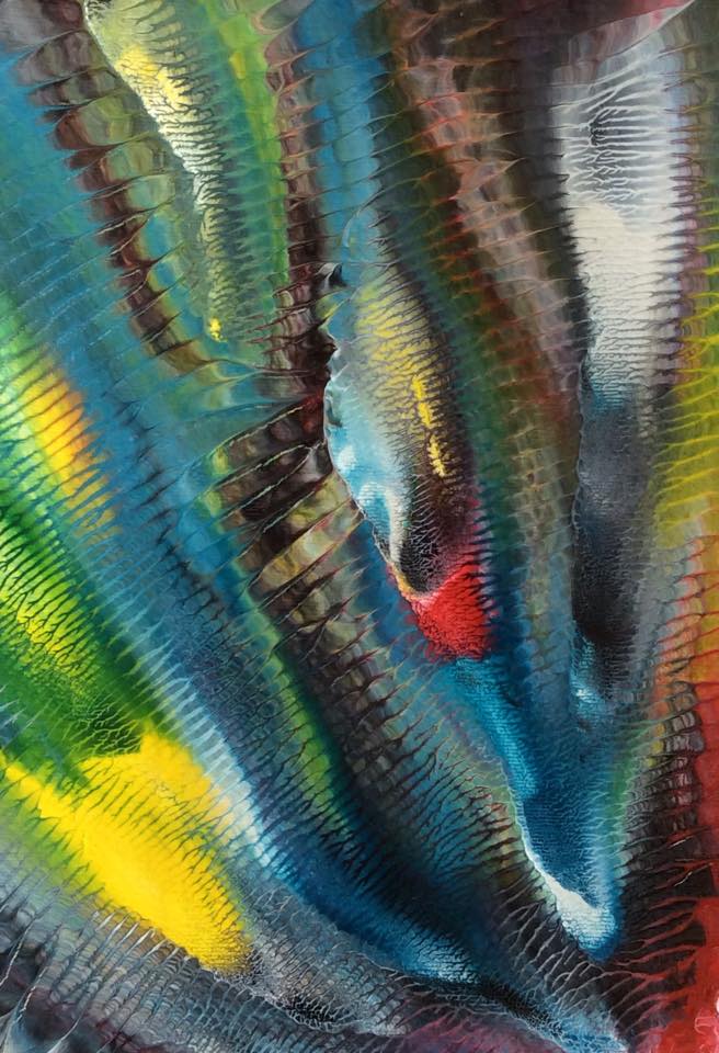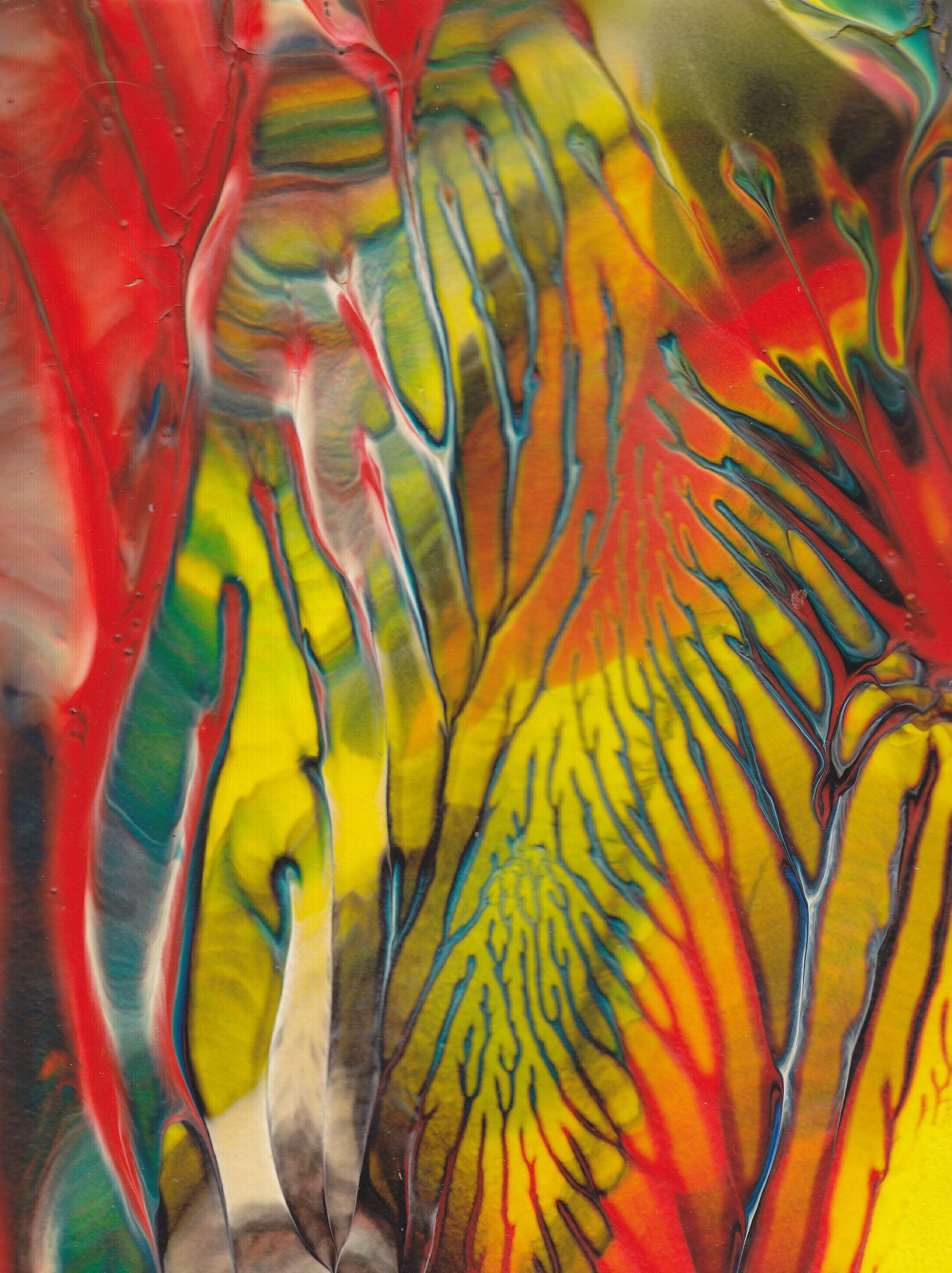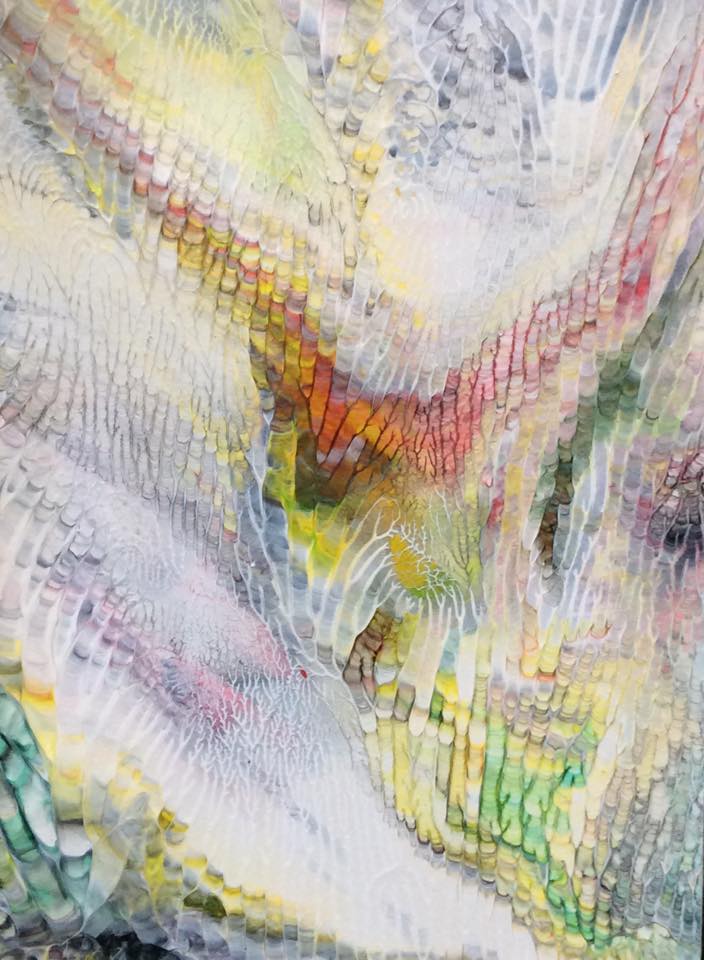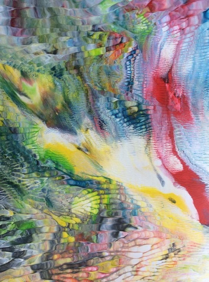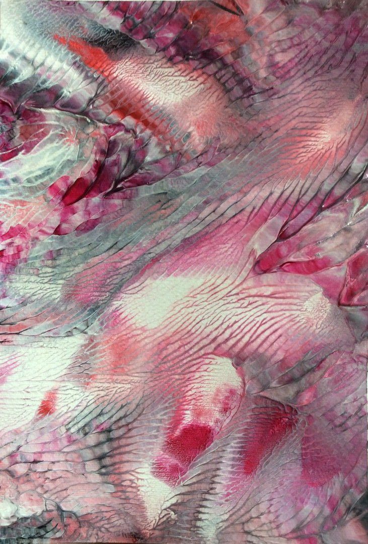 Jedes Bild der Serie LUMINOUS COLOURS ist ein harmonievolles Zusammenspiel von Farbgebung und Struktur. Mittels Décalcomanie (künstlerische Technik des Farbabzuges oder des Farbabklatsches) werden Acryl- oder Dispersionsfarben auf Zeichenkarton aufgebracht und anschließend mit Schellack versiegelt, um feinste Äderungen deutlich hervorzuheben und in brillanter Optik erscheinen zu lassen.