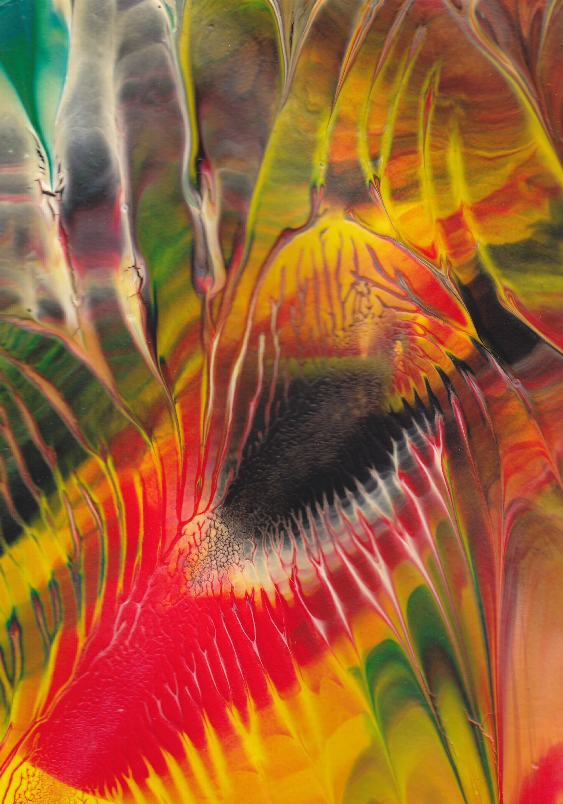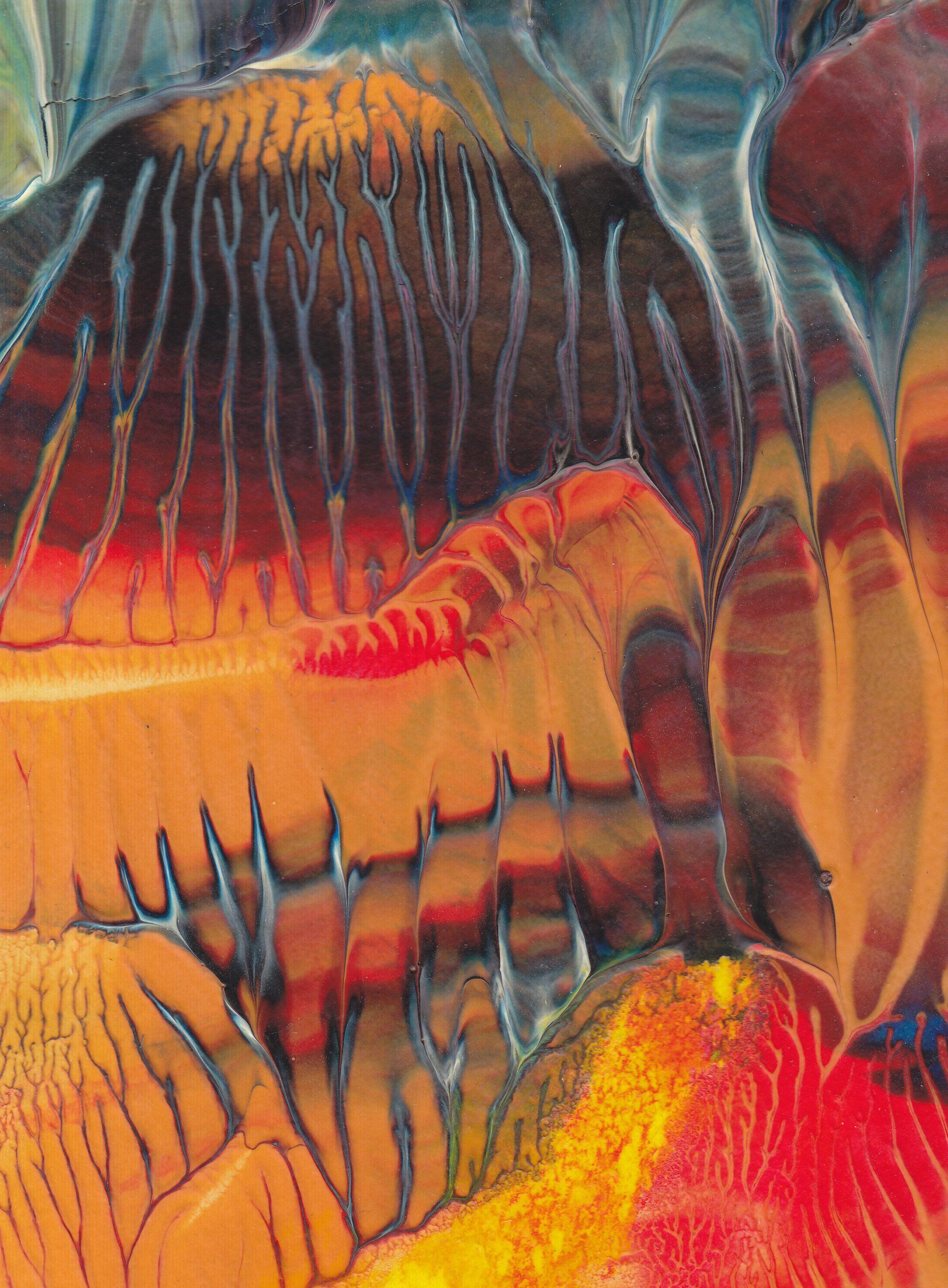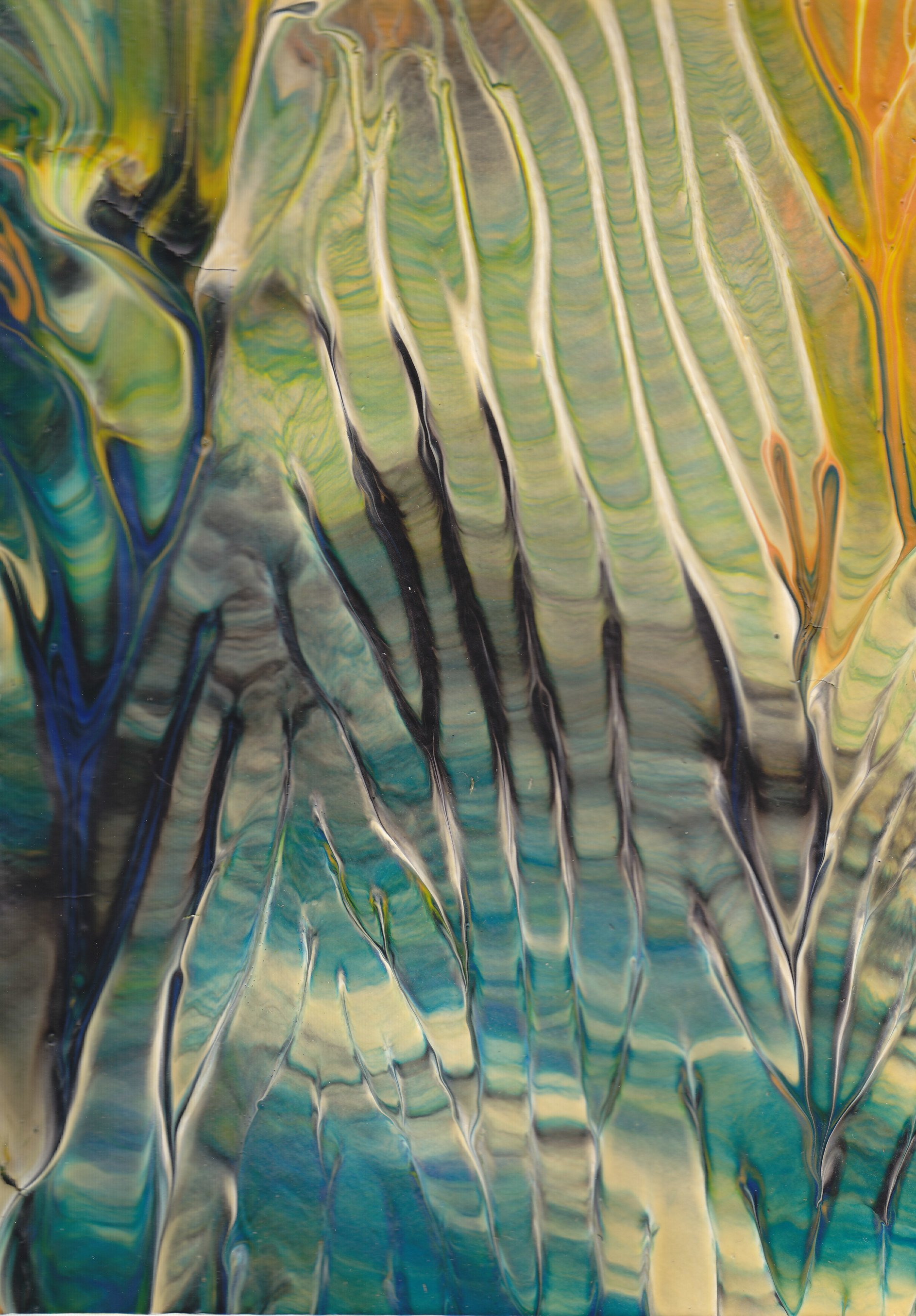 Jedes Bild der Serie LUMINOUS COLOURS ist ein harmonievolles Zusammenspiel von Farbgebung und Struktur. Mittels Décalcomanie (künstlerische Technik des Farbabzuges oder des Farbabklatsches) werden Acryl- oder Dispersionsfarben auf Zeichenkarton aufgebracht und anschließend mit Schellack versiegelt, um feinste Äderungen deutlich hervorzuheben und in brillanter Optik erscheinen zu lassen.