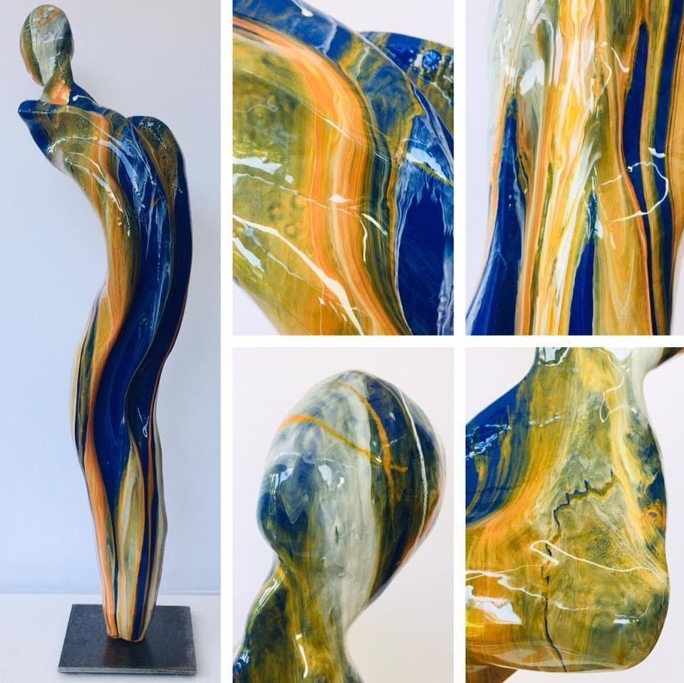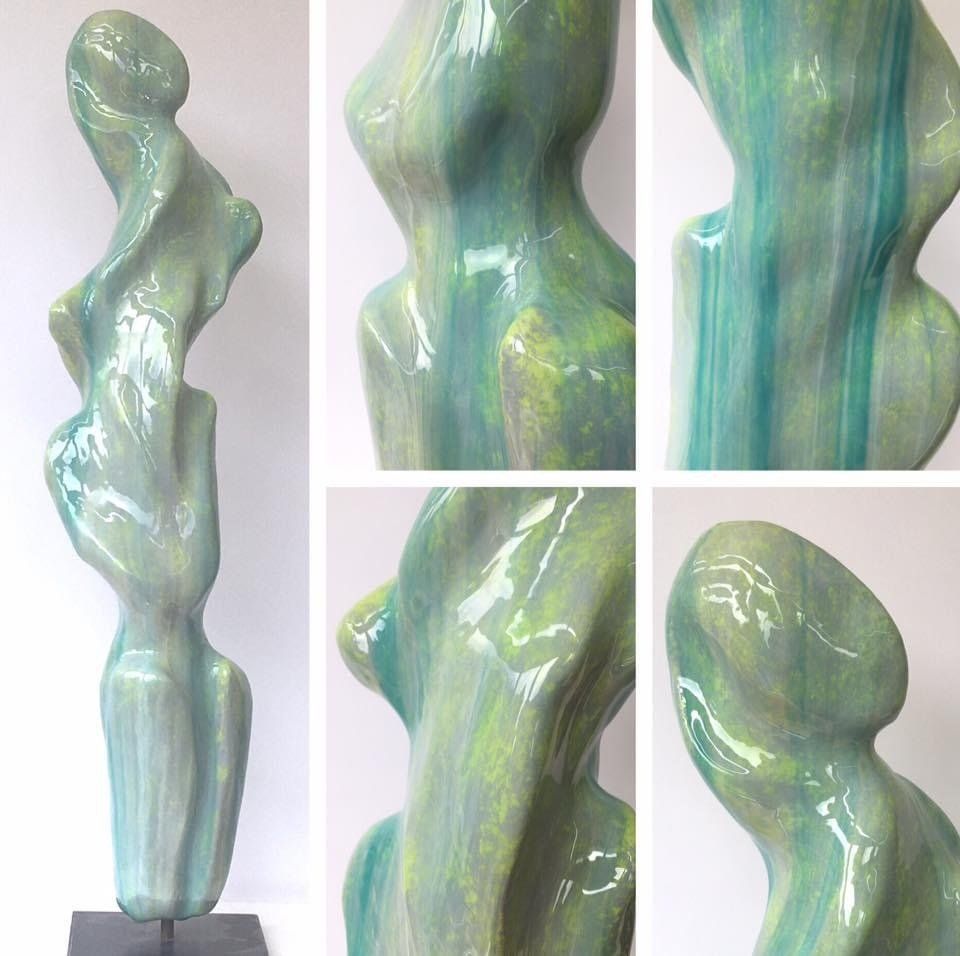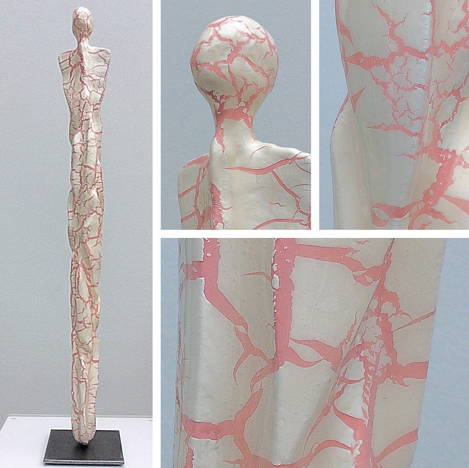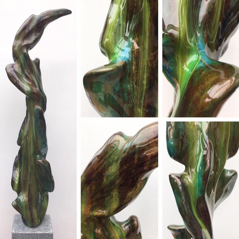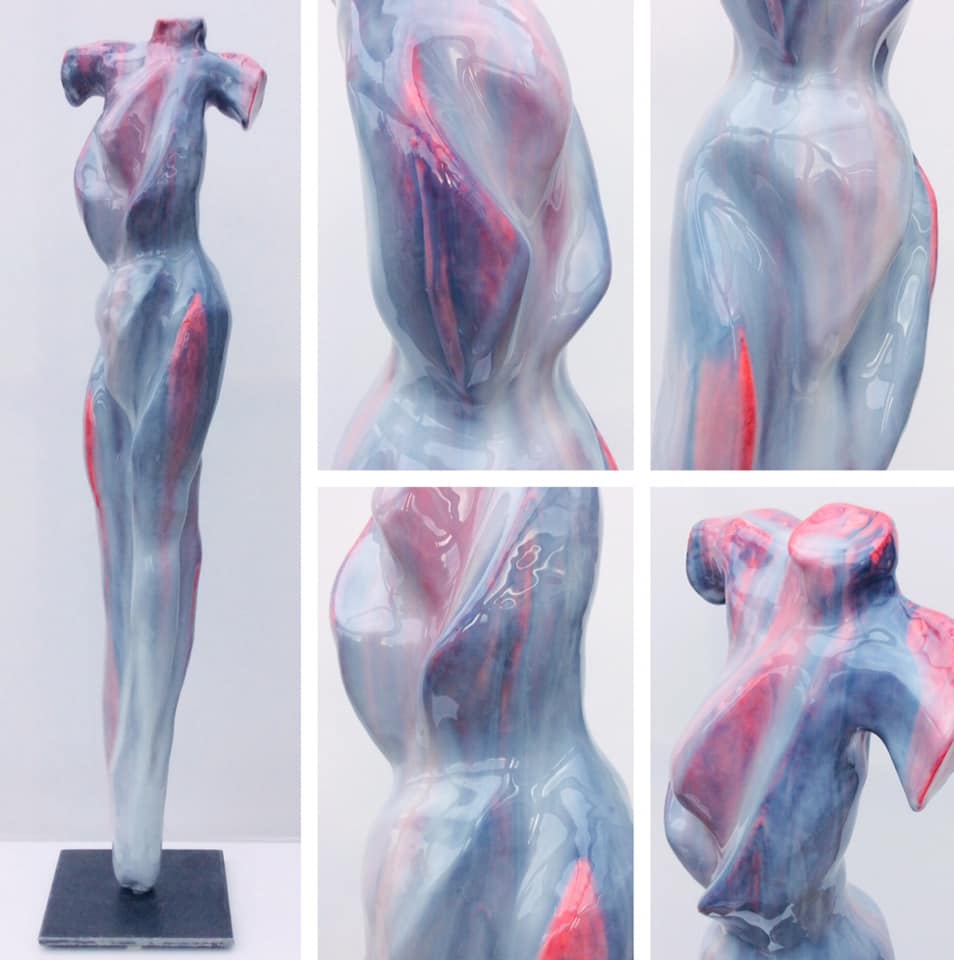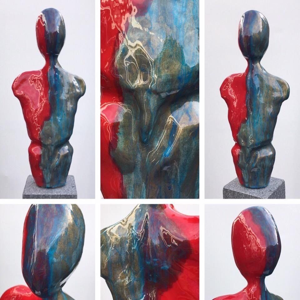 Androgyne Skulpturen aus Paperclay (spezieller Ton mit Zellulosefasern) gepaart mit farblicher Gestaltung und glänzender Kunstharz-Beschichtung (Resin) ergeben als Resultate Kunstwerke, die optisch und haptisch vergleichbar mit echten Keramikglasuren sind.