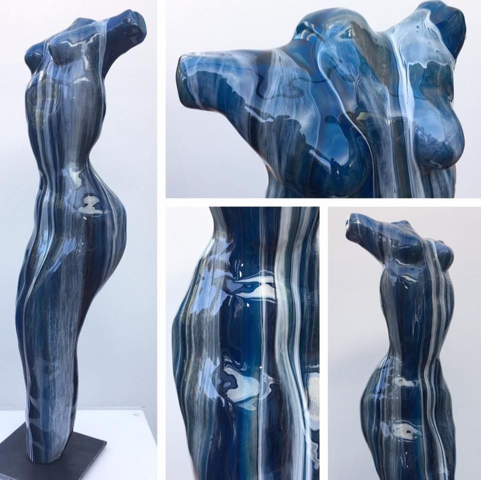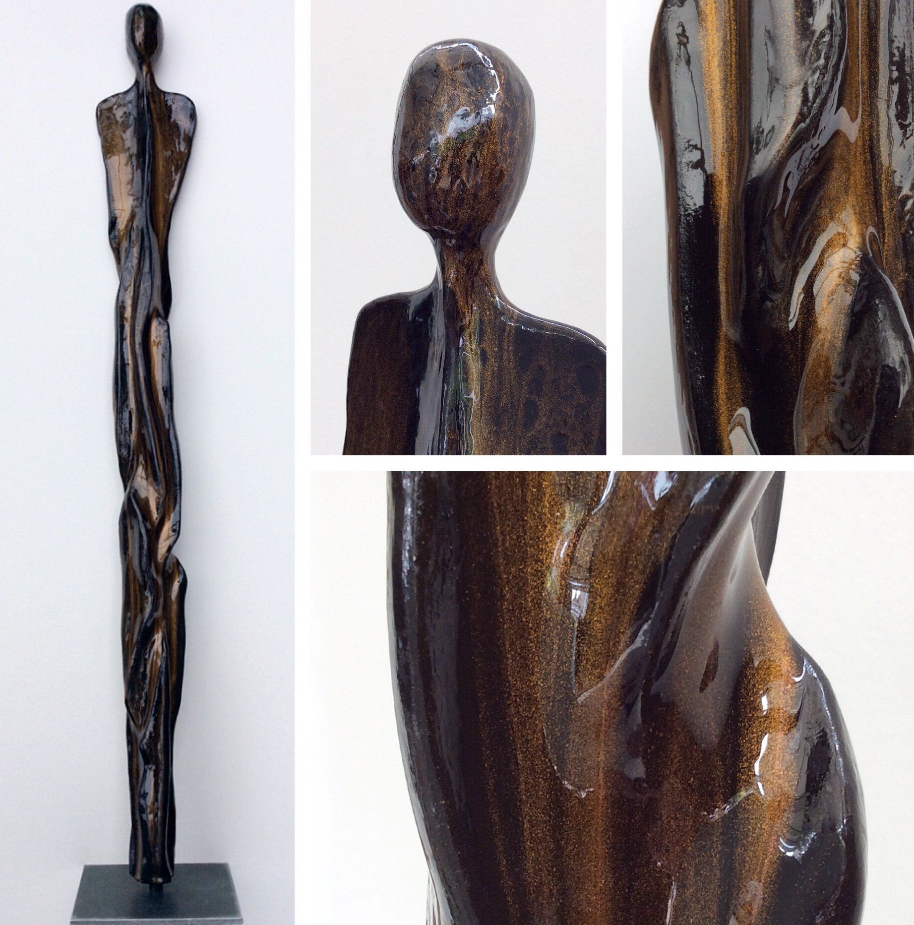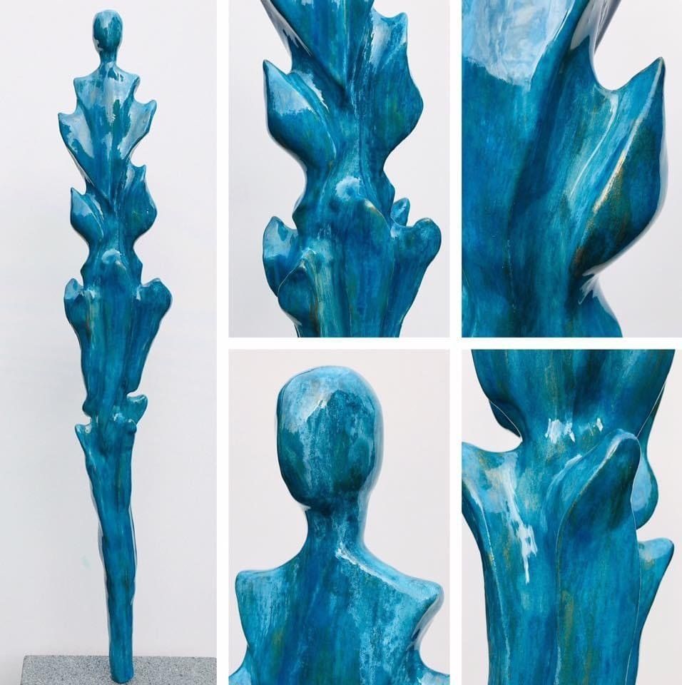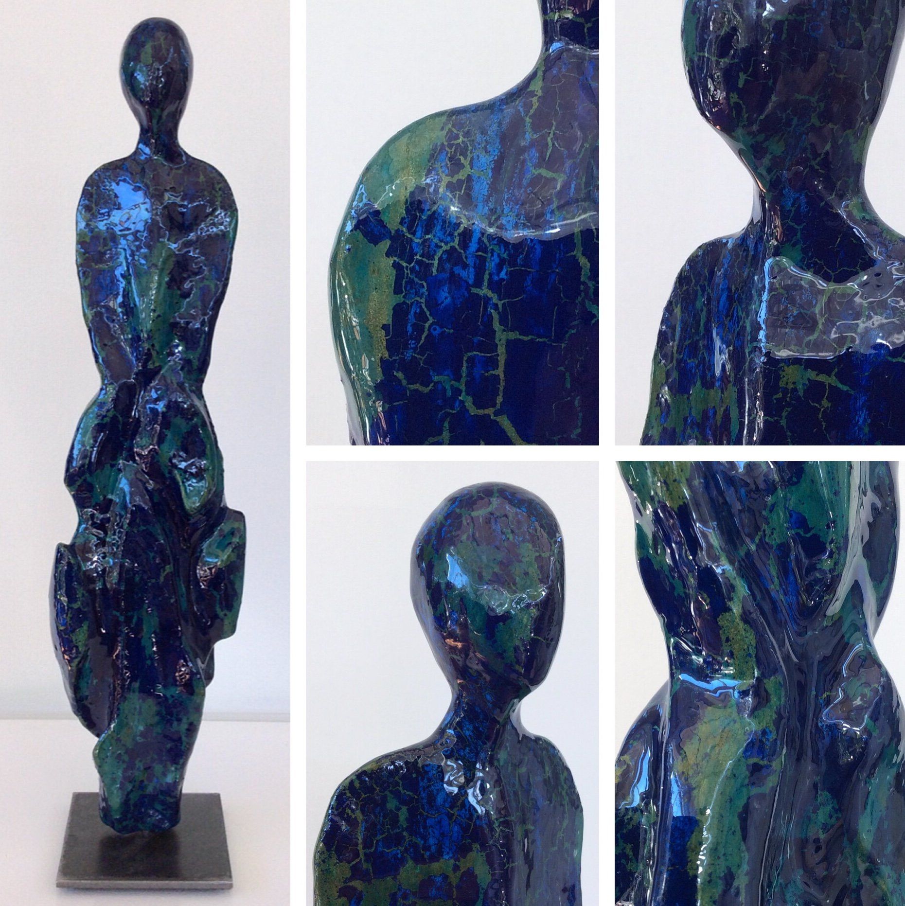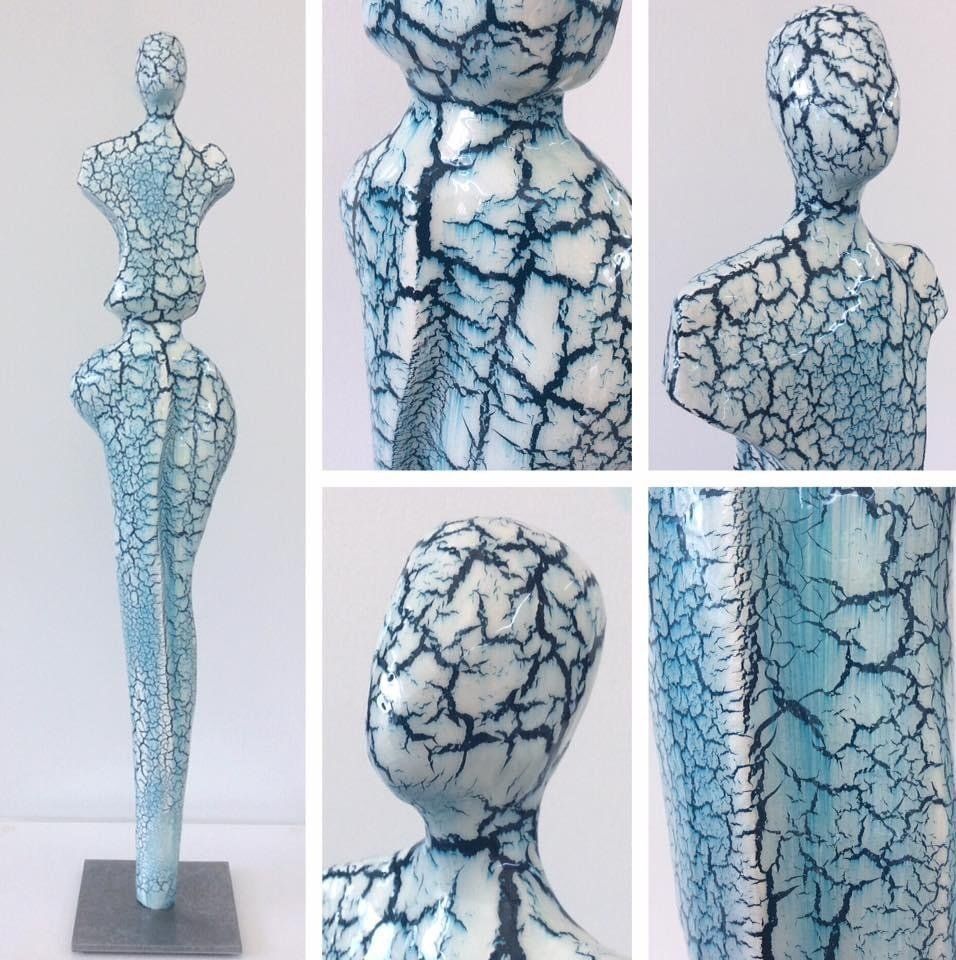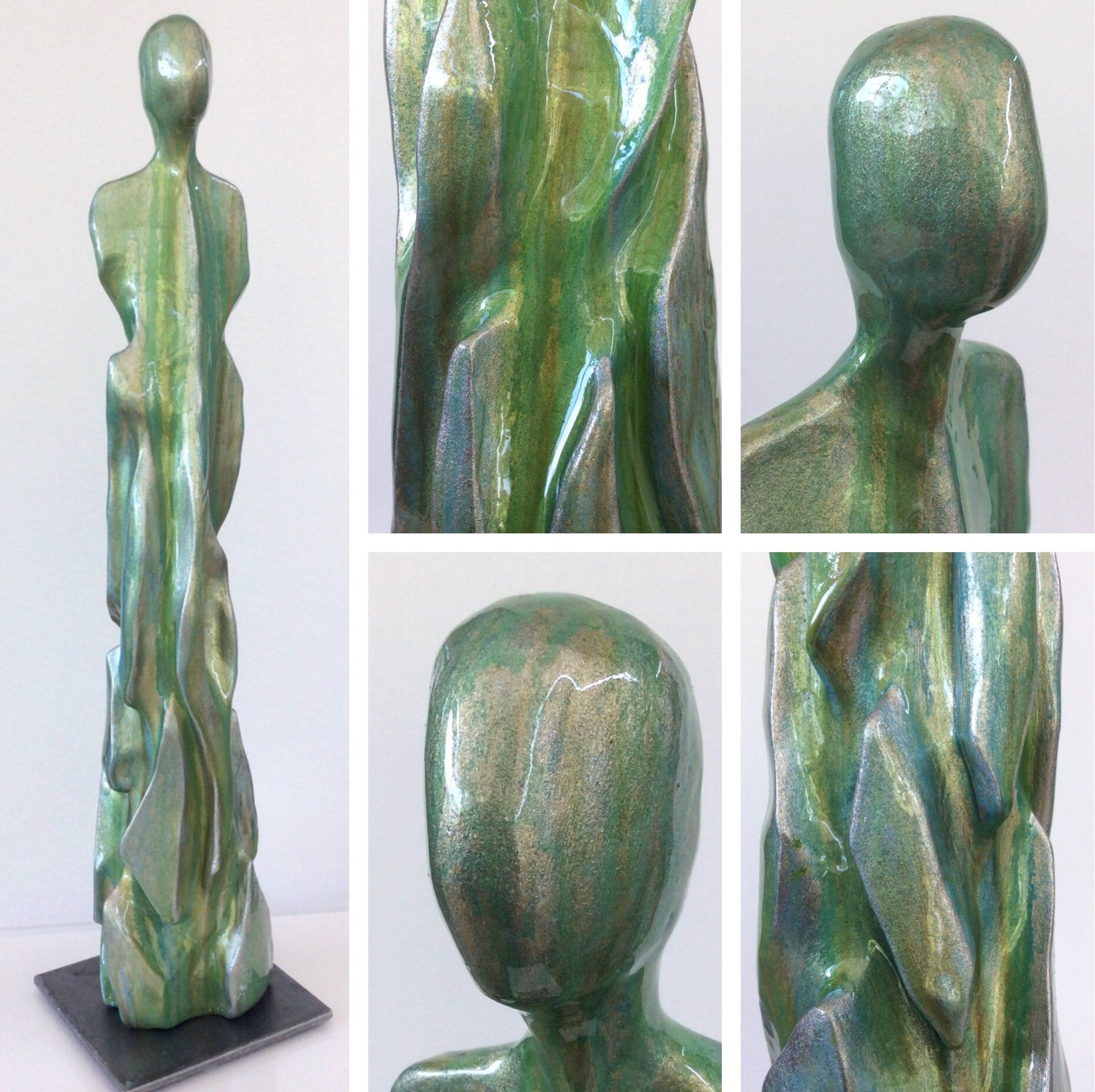 Androgyne Skulpturen aus Paperclay (spezieller Ton mit Zellulosefasern) gepaart mit farblicher Gestaltung und glänzender Kunstharz-Beschichtung (Resin) ergeben als Resultate Kunstwerke, die optisch und haptisch vergleichbar mit echten Keramikglasuren sind.
