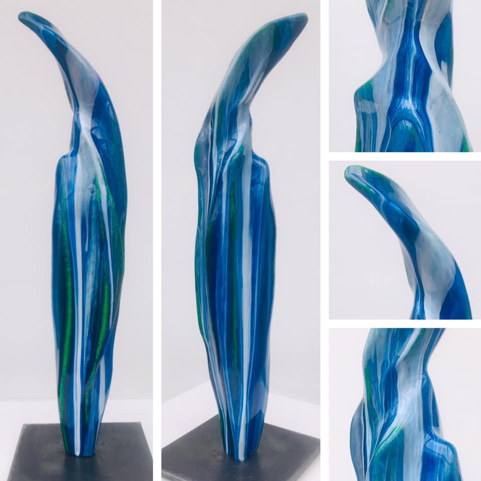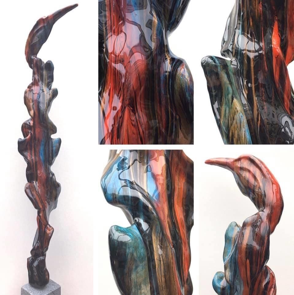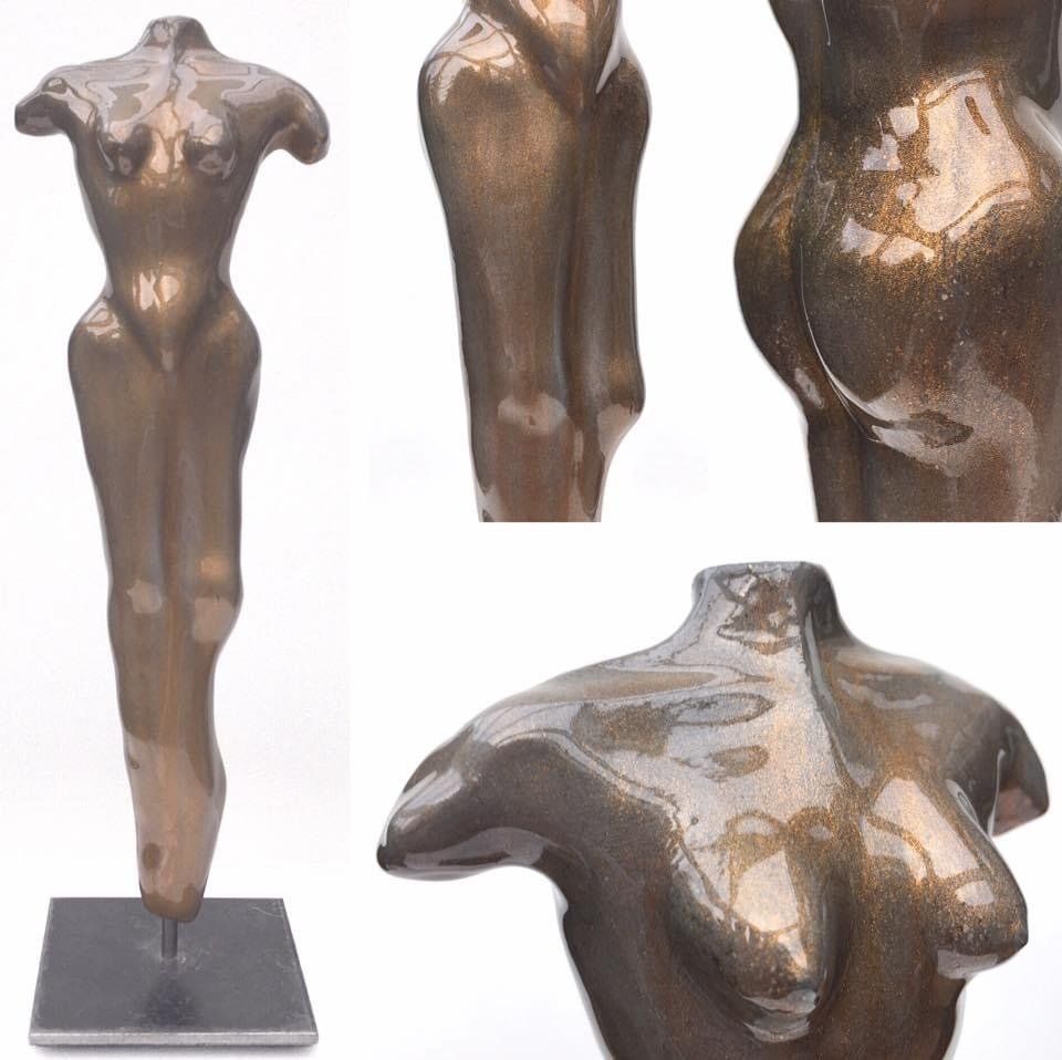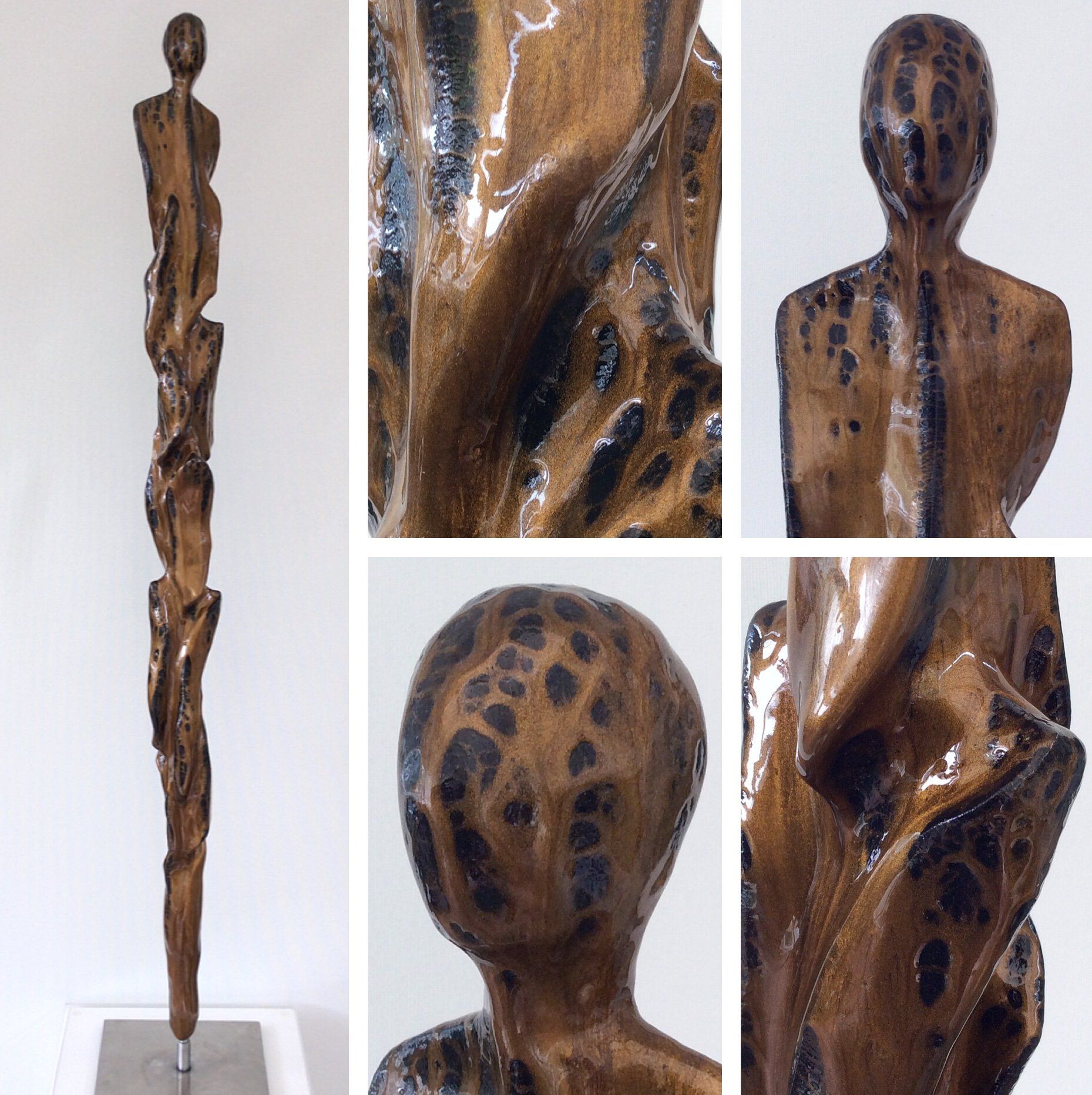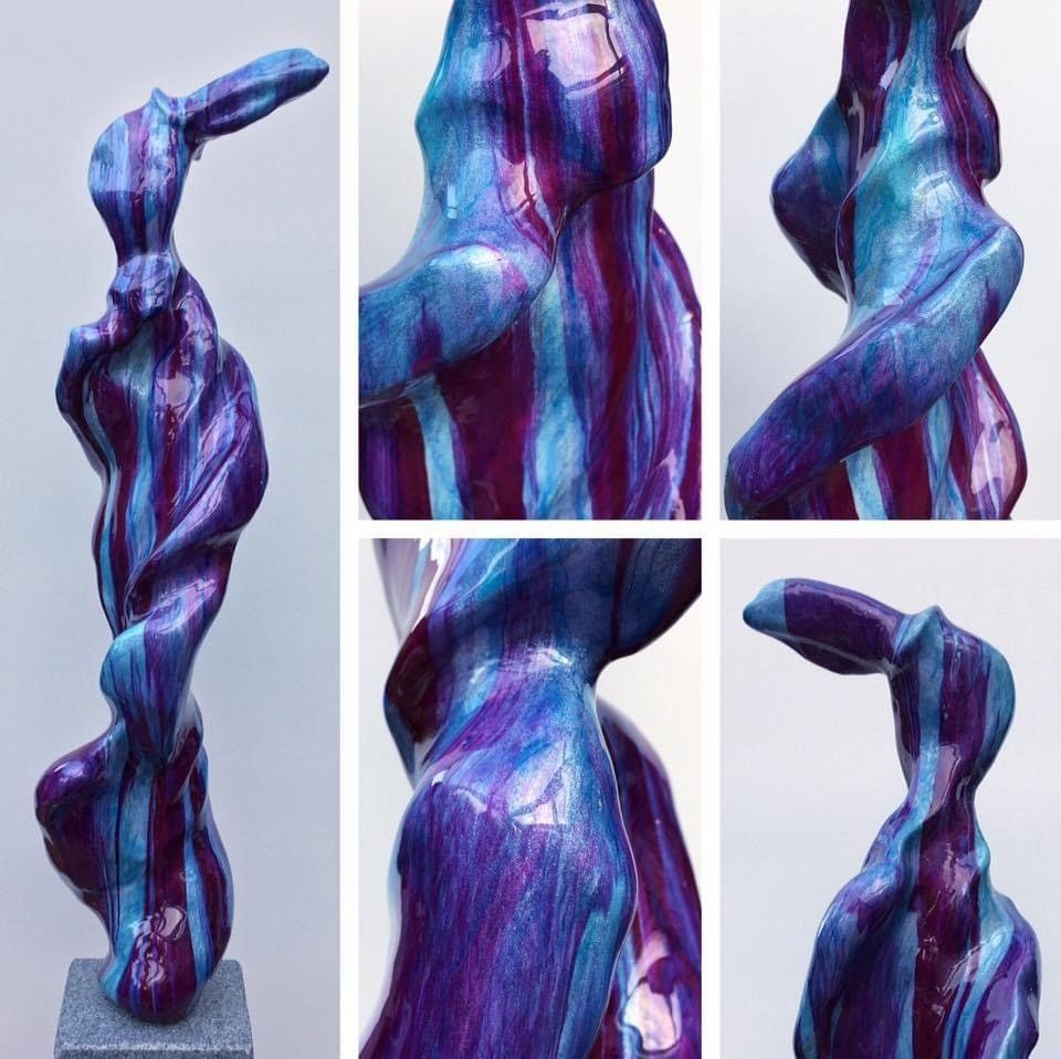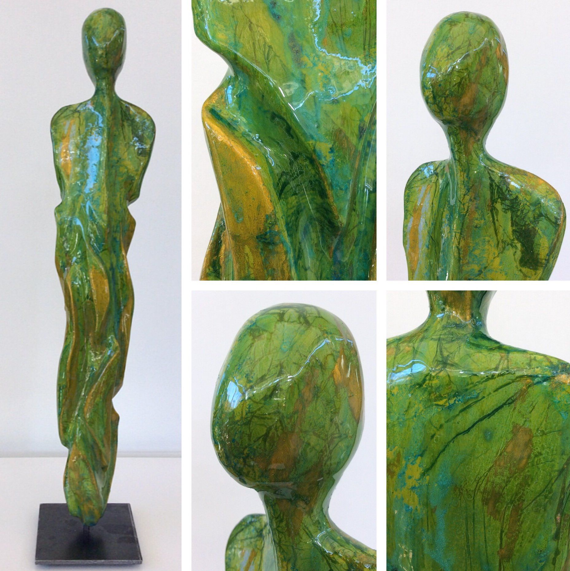 Androgyne Skulpturen aus Paperclay (spezieller Ton mit Zellulosefasern) gepaart mit farblicher Gestaltung und glänzender Kunstharz-Beschichtung (Resin) ergeben als Resultate Kunstwerke, die optisch und haptisch vergleichbar mit echten Keramikglasuren sind.