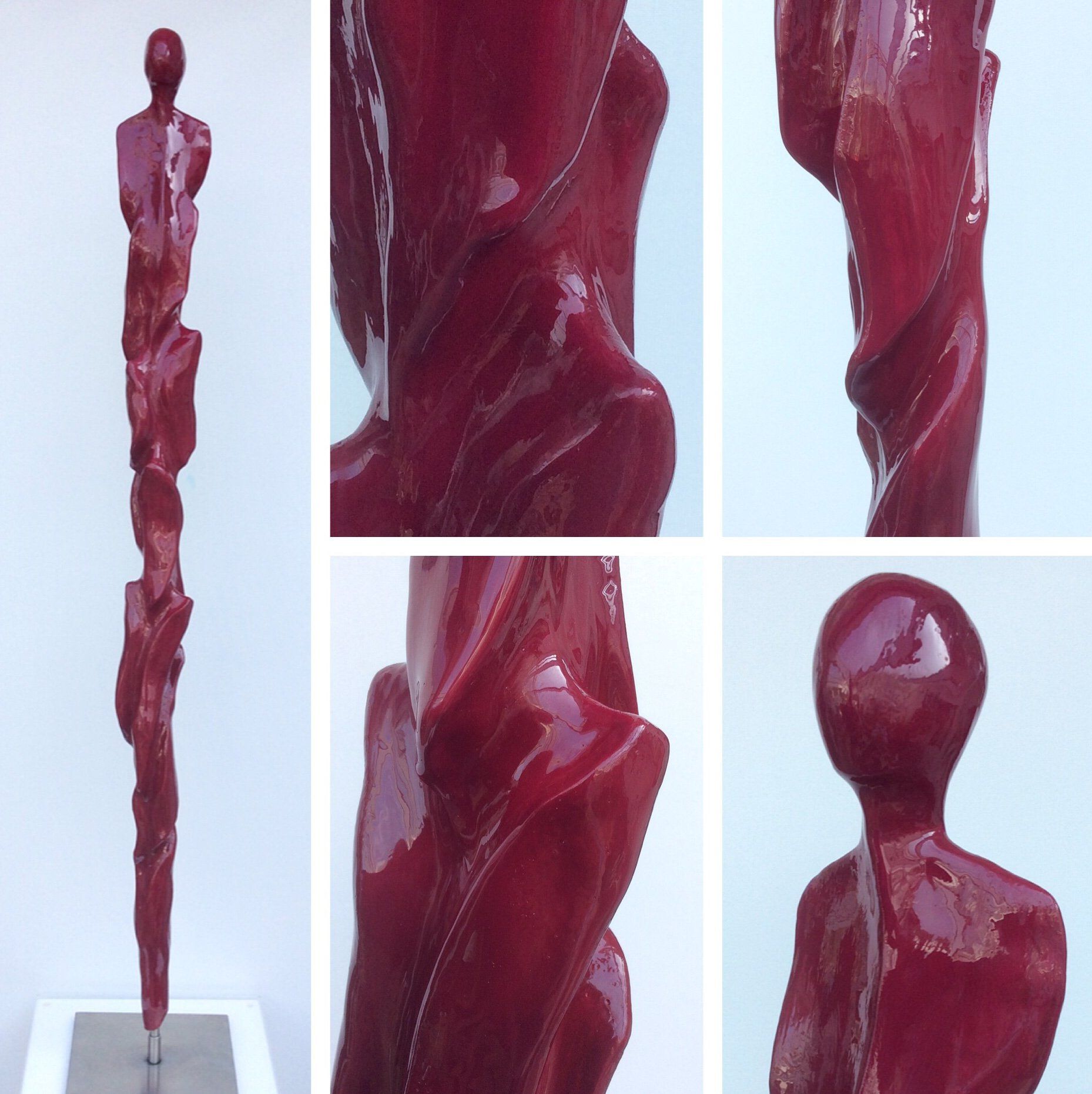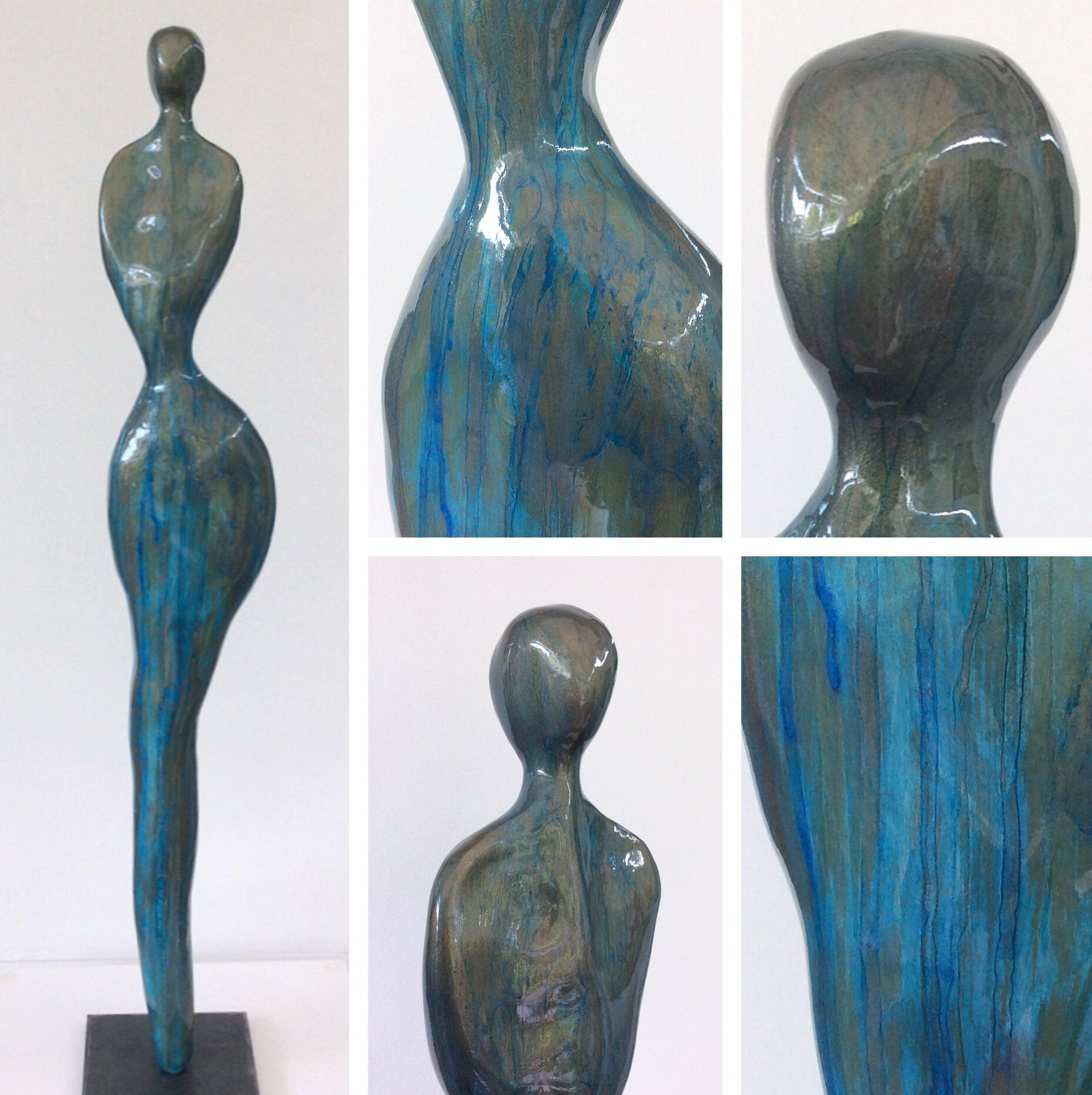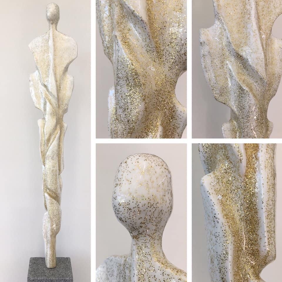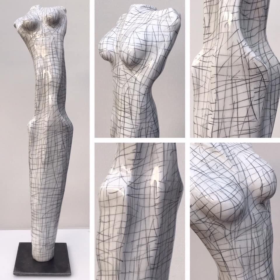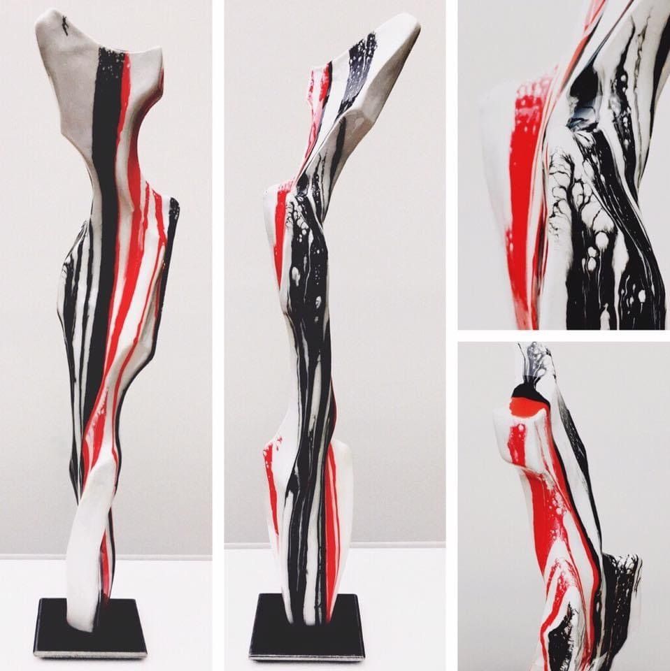 Androgyne Skulpturen aus Paperclay (spezieller Ton mit Zellulosefasern) gepaart mit farblicher Gestaltung und glänzender Kunstharz-Beschichtung (Resin) ergeben als Resultate Kunstwerke, die optisch und haptisch vergleichbar mit echten Keramikglasuren sind.