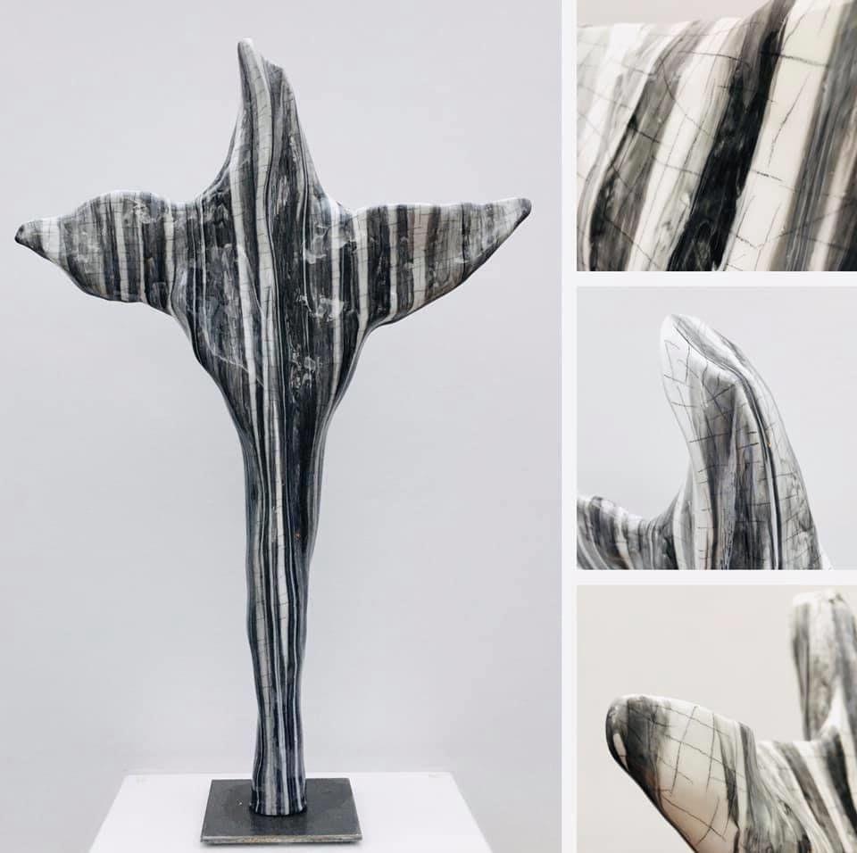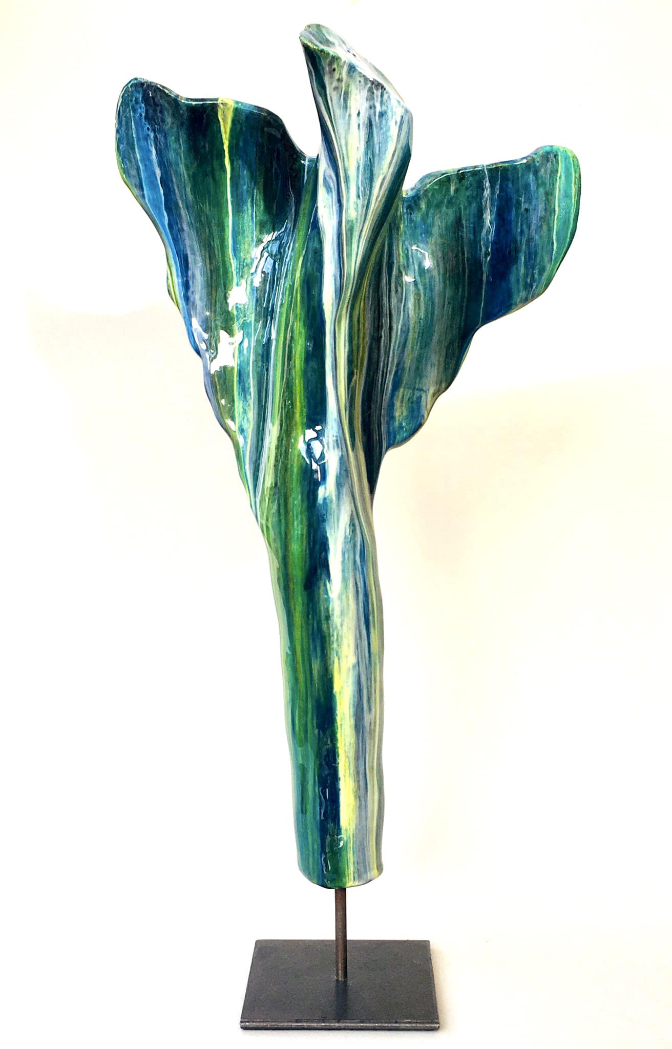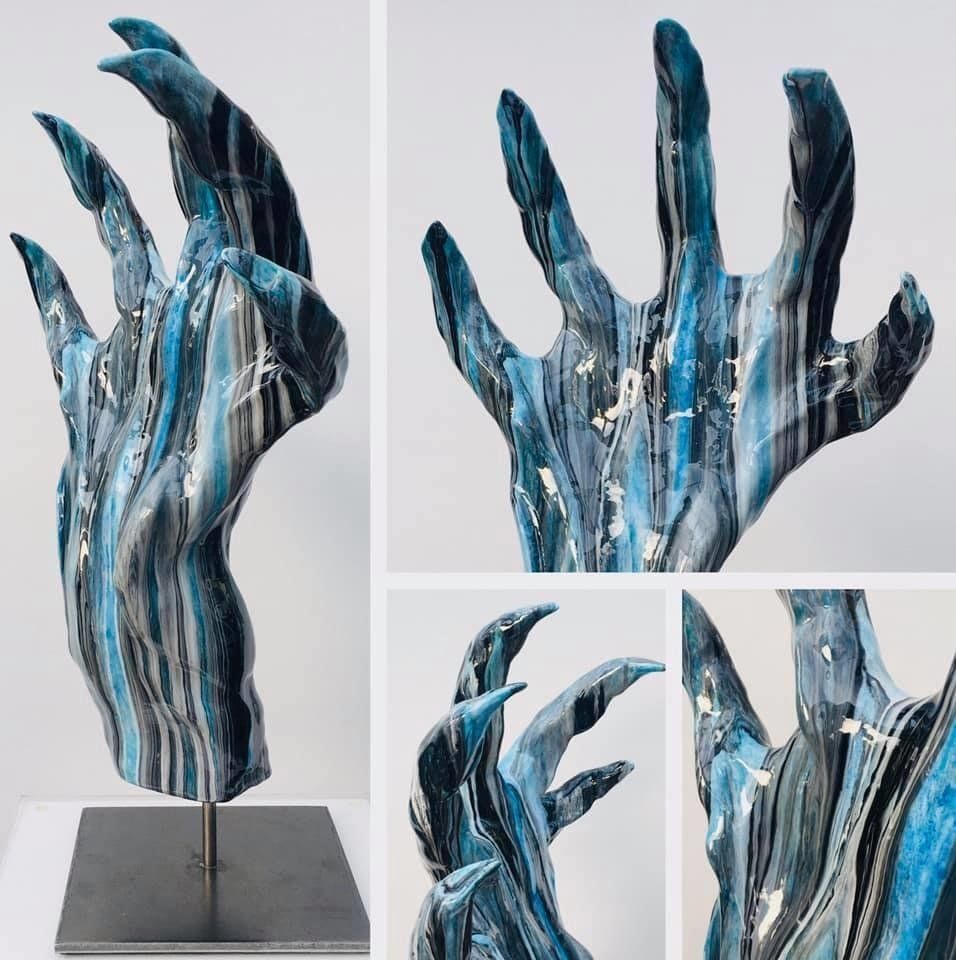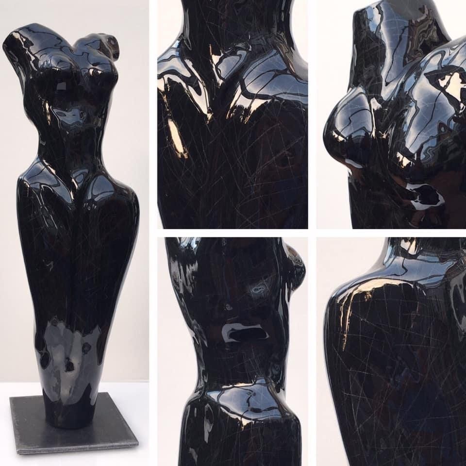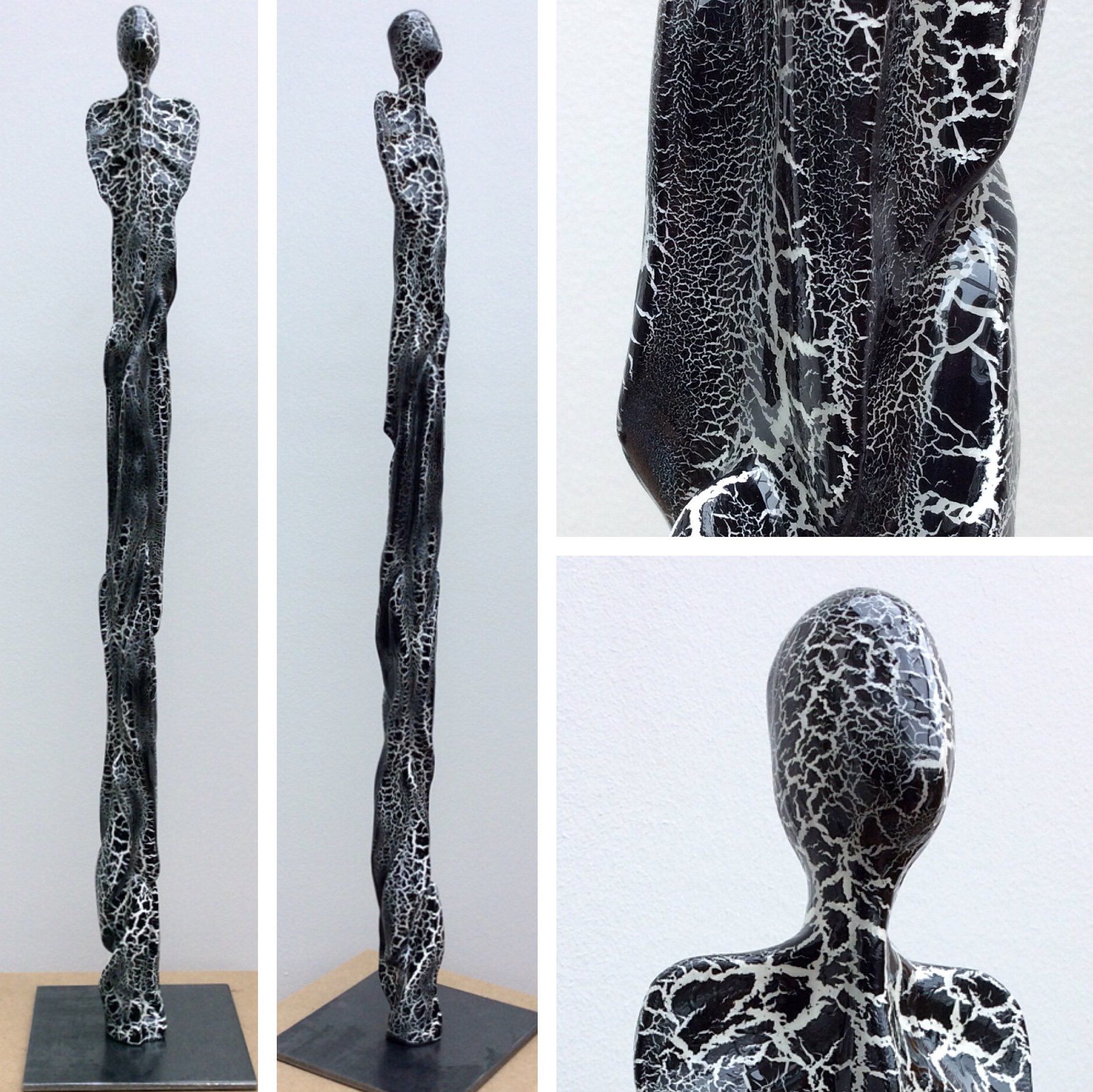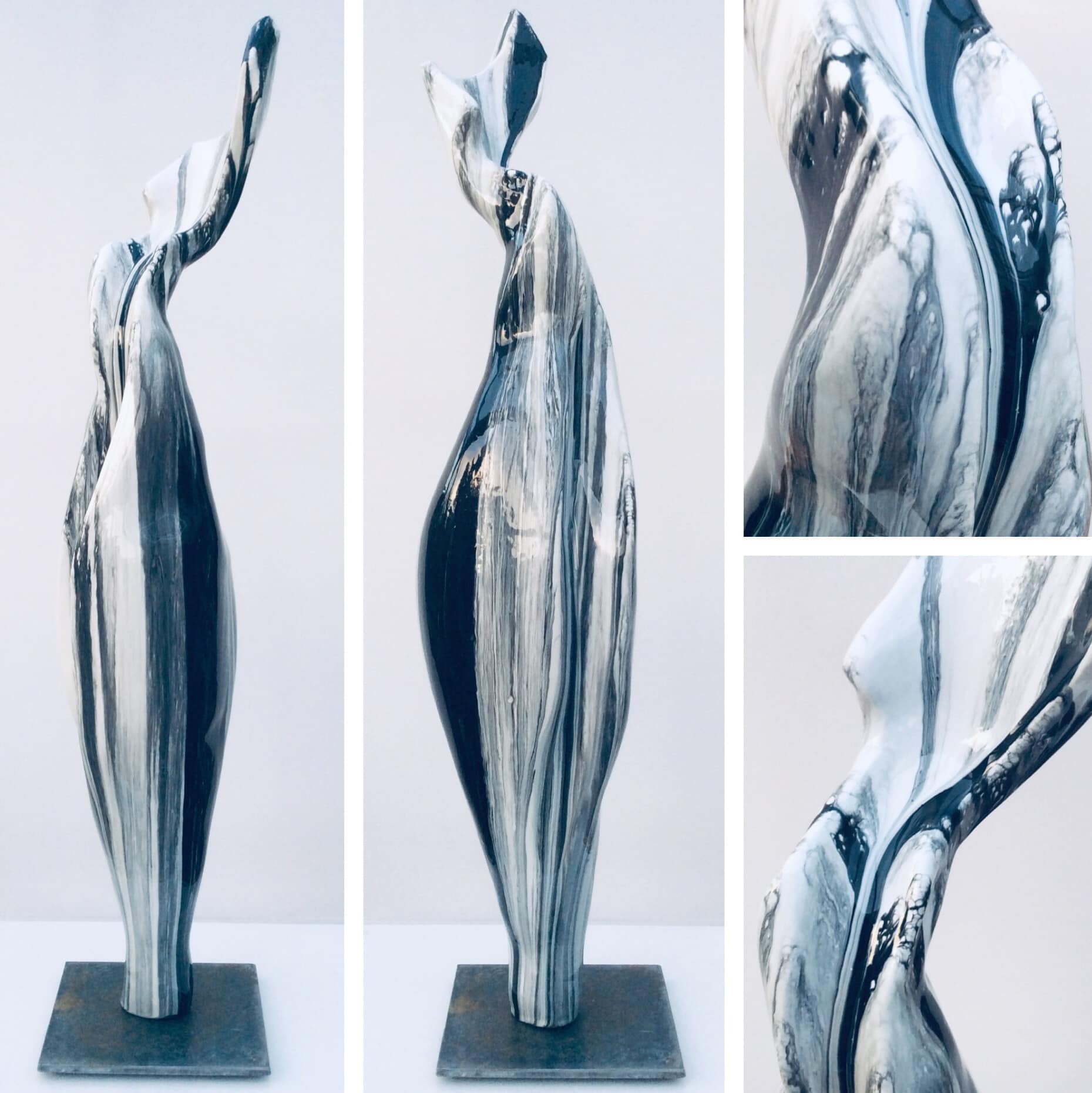 Androgyne Skulpturen aus Paperclay (spezieller Ton mit Zellulosefasern) gepaart mit farblicher Gestaltung und glänzender Kunstharz-Beschichtung (Resin) ergeben als Resultate Kunstwerke, die optisch und haptisch vergleichbar mit echten Keramikglasuren sind.
