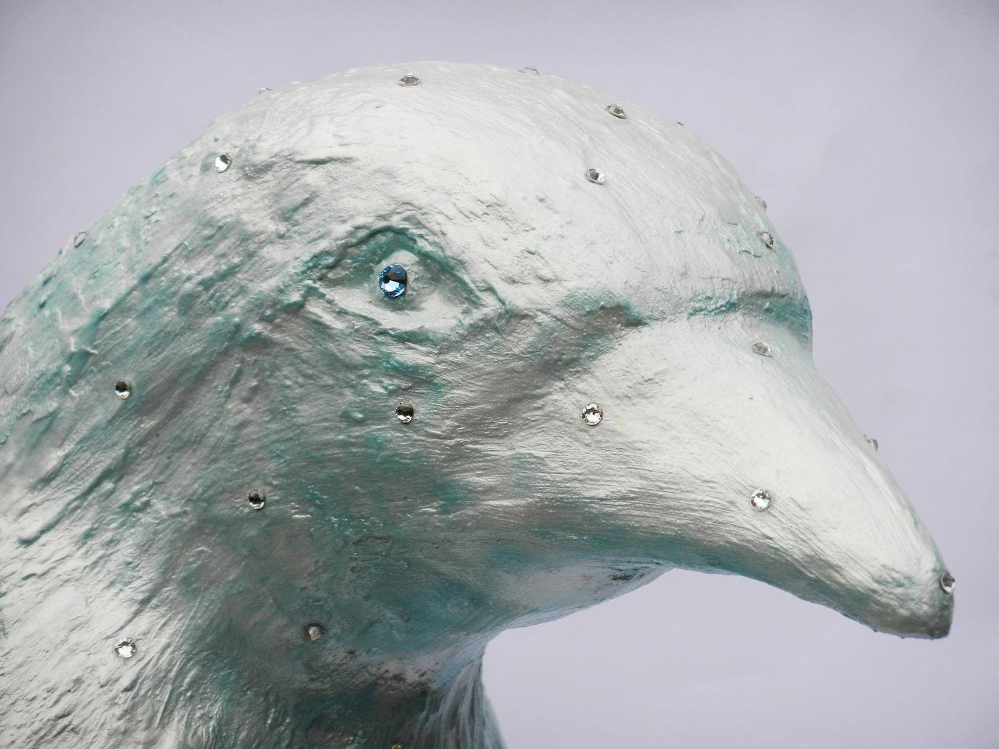 Der "Eispinguin" ist mit einer groben Matrix überzogen, die in Eisblau lasiert und abschließend mit Perlmutteffekt versiegelt ist. Als krönenden Abschluss zieren 700 Swarovski-Elements Xilion in Crystal, 4,6-4,8 mm die gesamte Präsenz. Die Augen sind durch jeweils einem Swarovski-Elements Xilion in Aquamarine, 7,0-7,2 mm akzentuiert. Diese hochwertigen Schmucksteine lassen das Gesamtkunstwerk in funkelnder, brillanter Erscheinung erstrahlen.