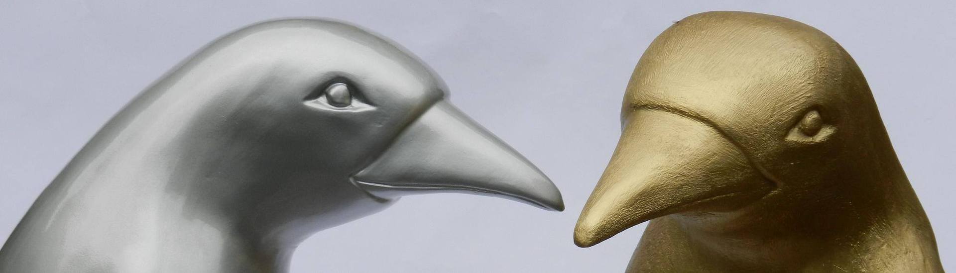 Hochglänzender Lack in Chromoptik ziert einen weiteren Pinguin, der durch Eleganz, Schlichtheit und einer glatten spiegelglänzenden Oberfläche besticht. Der zweite Pinguin ist mit mattem, edlem Goldlack auf gebürstet strukturierter Oberfläche beschichtet.